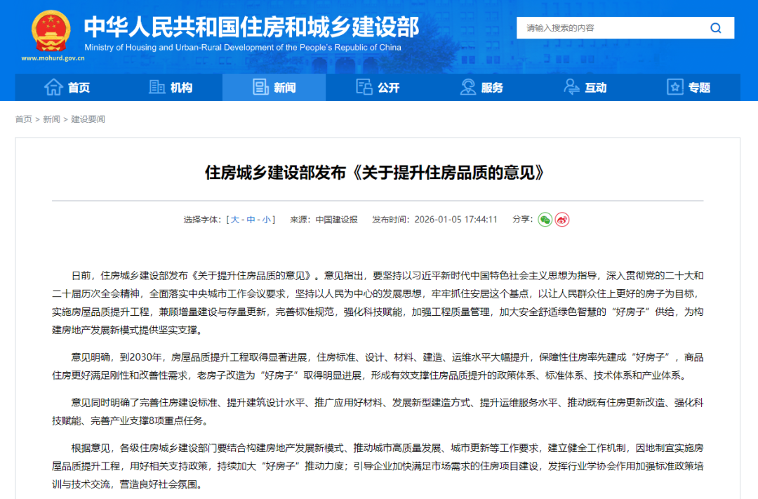 住建部在2025年12月首次系统提出“好房子”建设标准,并明确2026年起在全国推行。