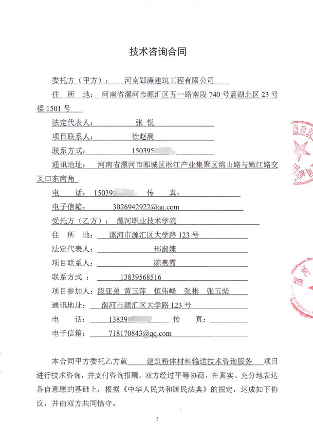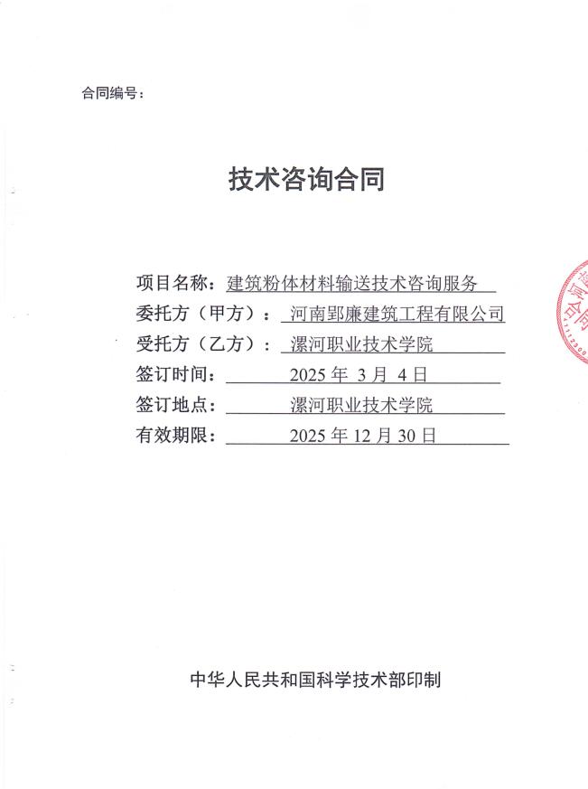 新型建筑工业化科技创新平台团队成员陈燕霞、段亚弟完成河南鄂廉建筑工程有限公司委托的建筑粉体材料输送技术咨询服务项目,合同金额15000元整。