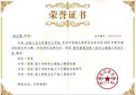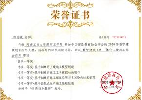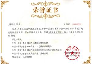 2020年数字建筑创新应用大赛(原“全国高等院校BIM应用技能大赛”)由中国建设教育协会主办,广联达科技股份有限公司、北京睿格致科技有限公司协办。由于疫情影响,大赛于2020年10月24日在线上举办,全国共有303所院校的2660个团队,13300名师生参赛。河南工业大学漯河工学院派出的2018级工程管理专业三支代表队全部荣获团体一等奖,并获11项个人专项一等奖,首次实现了参赛团队及个人全部获得一等奖大满贯的优异成绩。