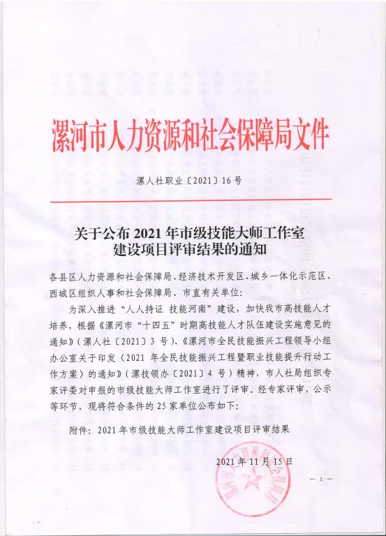 2021年11月24日下午,漯河市人力资源和社会保障局召开会议宣布了我市2021年度市级技能大师工作室建设项目评审结果,本次共有25家被评为市级技能大师工作室,我院漯河市周成科工程造价技能大师工作室位列其中。