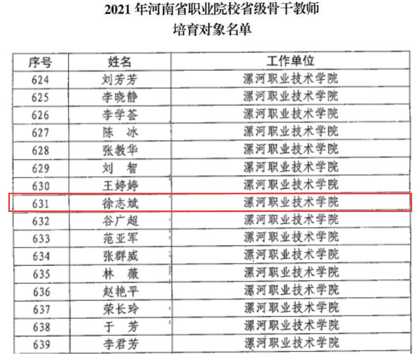 近日,河南省教育厅 河南省人力资源和社会保障厅印发《关于2021年河南省职业院校省级名师和省级骨干教师培育对象名单的通知》(教职成〔2022〕115号),漯河职业技术学院李绍鹏、范晓迪、张超凡等5位教师被评为2021年河南省职业院校省级名师培育对象,徐志斌、李晓静、李学荟等16名教师被评为2021年河南省职业院校省级骨干教师培育对象。