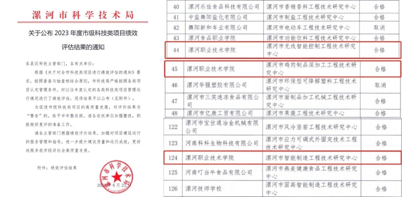 近日,漯河市科学技术局公布了2023年度市级科技类项目绩效评估结果,漯河职业技术学院“漯河市智能建造工程技术中心”顺利通过验收、成绩合格。